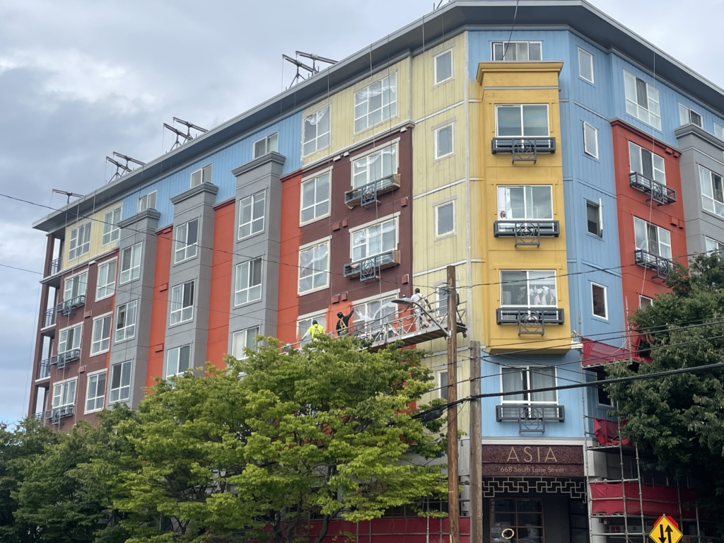 In 2025 Northwest Residential and Commercial Painting Co. LLC was hired to paint the Exterior of the Asia Condominiums in Downtown Seattle. This 7-story Exterior Multi-family Repaint project was one of our highlights of the year.  The clients selected a bright and bold color scheme that showcased asian heritage.  We were proud to be part of this major facelift.